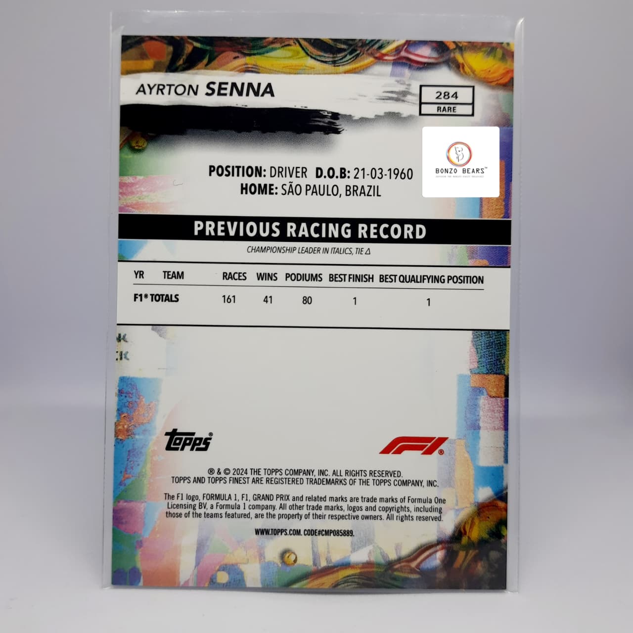 Shop the Ayrton Senna 2024 Topps Finest F1 #284 Blue Refractor (19/99) at Bonzo Bears. A rare collectible limited to 99 copies worldwide — a true tribute to the F1 legend.