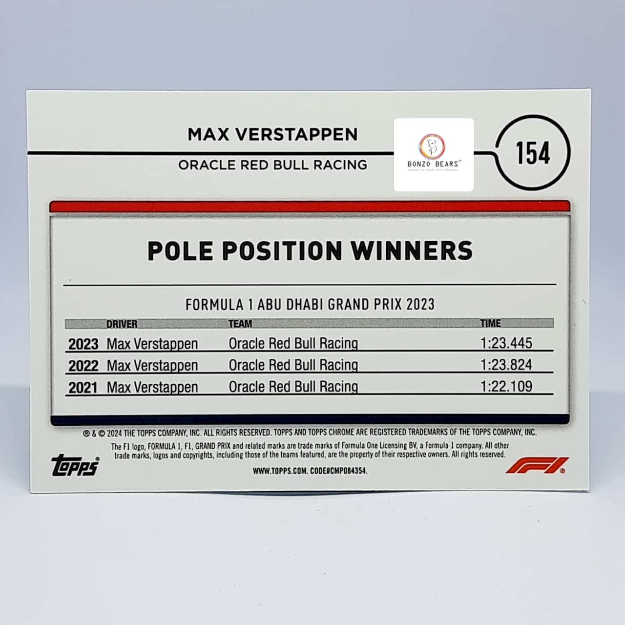 Shop the Max Verstappen 2024 Topps Chrome F1 #154 Aqua Sonar Refractor (027/150) at Bonzo Bears. Limited to 150 copies worldwide — a rare and premium collectible for F1 fans.