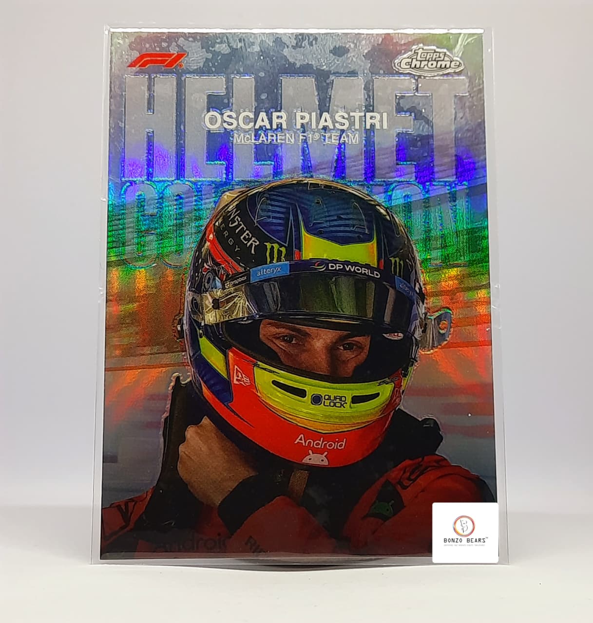 Shop the Oscar Piastri 2024 Topps Chrome F1 Helmet Card at Bonzo Bears. A premium McLaren collectible featuring vibrant chrome design — perfect for F1 and rookie card collectors.