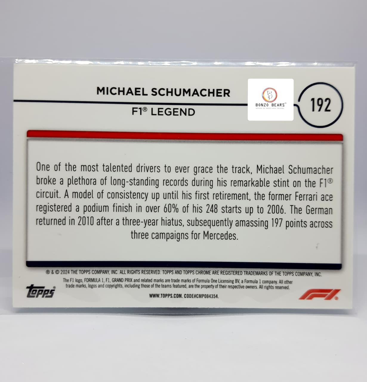 Shop the Michael Schumacher 2024 Topps Chrome F1 #192 Purple/Green Special Parallel Refractor at Bonzo Bears. A premium collectible honoring the F1 legend with vibrant refractor detailing.