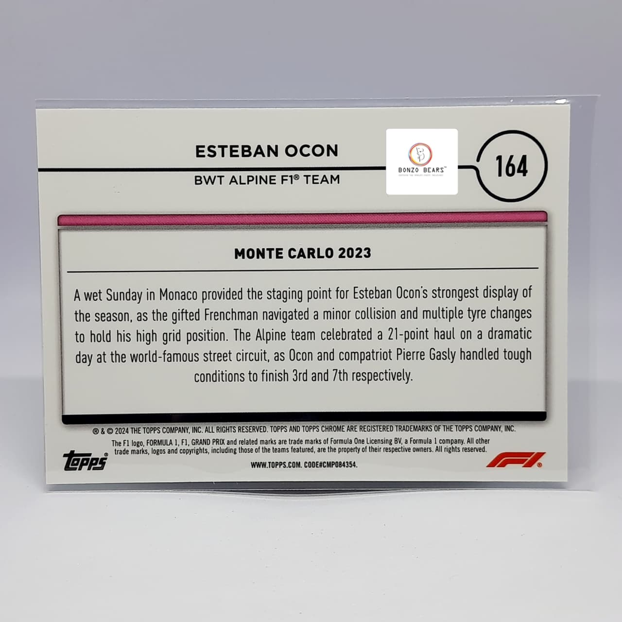 Add a vibrant piece of modern Formula 1 history to your collection with the Esteban Ocon Logo Refractor #164, numbered 42/99, available at Bonzo Bears. This premium Topps Chrome card highlights Ocon in his BWT Alpine Team livery, enhanced with a striking logo refractor finish, making it an eye-catching collectible for any F1 fan.