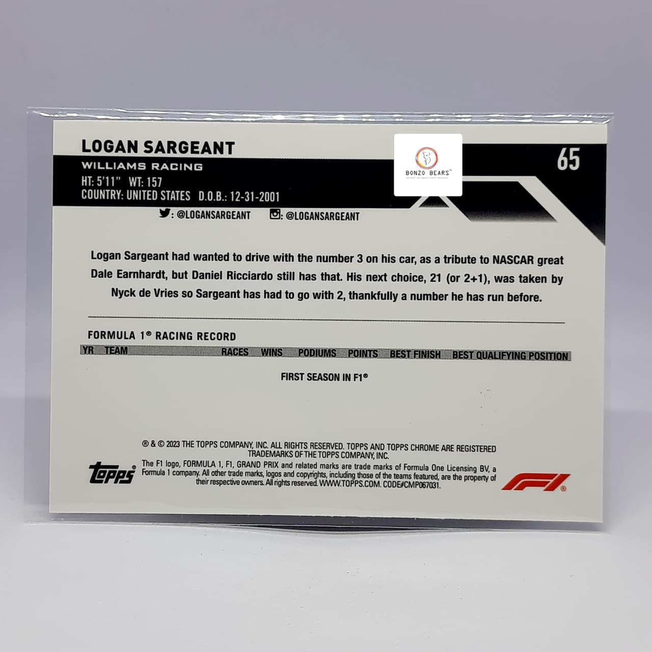 Mini Diamond Logan Sargeant RC Rookie 085/299(Limited to 299 PrintsWorld Wide) #65- 2023 Topps Chrome Formula 1 card - William Racing Team